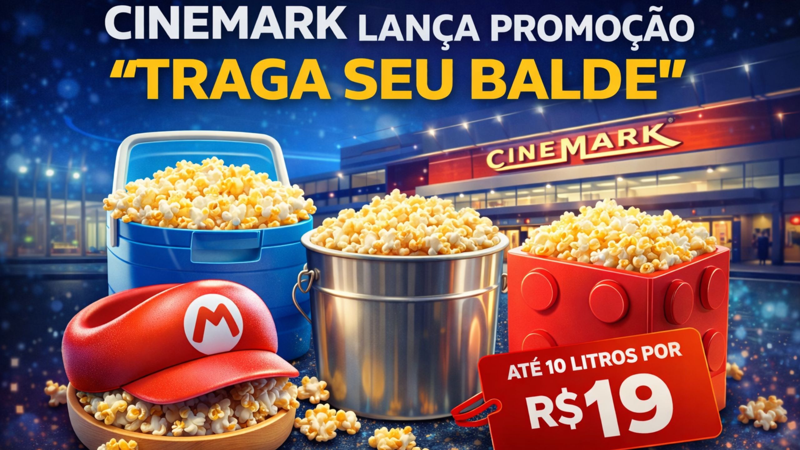 Promoção Criativa nos Cinemas: Cinemark Lança Evento “Traga Seu Balde” e Permite Encher Até 10 Litros de Pipoca por Preço Especial